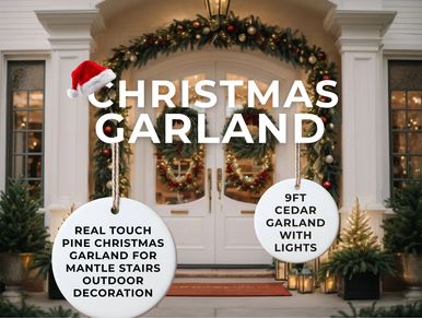 9FT Cedar Garland with Lights, Prelit Christmas Garland Artificial Realistic, Real Touch Pine Christmas Garland for Mantle Stairs Outdoor Decoration, Battery Operated Faux Greenery Garlands Thick Lush.